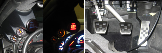 The wideband installation was a job. I purchased an Innovate Motorsports LC-1 kit (which so far I would recommend). It comes with a gauge to display the A/F ratio. Cool! But that meant that I had to switch out my two gauge pillar (which has fuel and boost pressure gauges) with a three gauge pillar. No sweat, right? Advice: When switching out gauge pillars don’t try to make anchor pin holes in the same spot as the old gauge pillar. Just pull out the pillar trim, drill new holes, wire everything up, attach the gauge pillar back to the trim and put it back in.